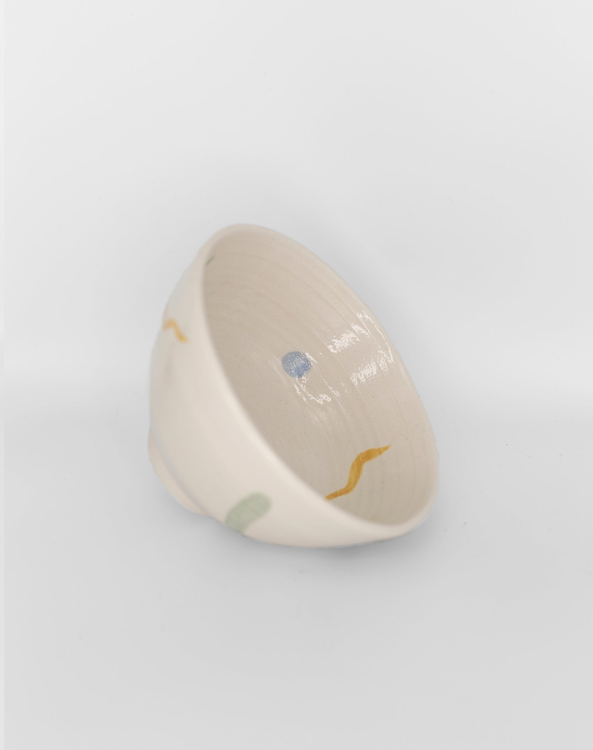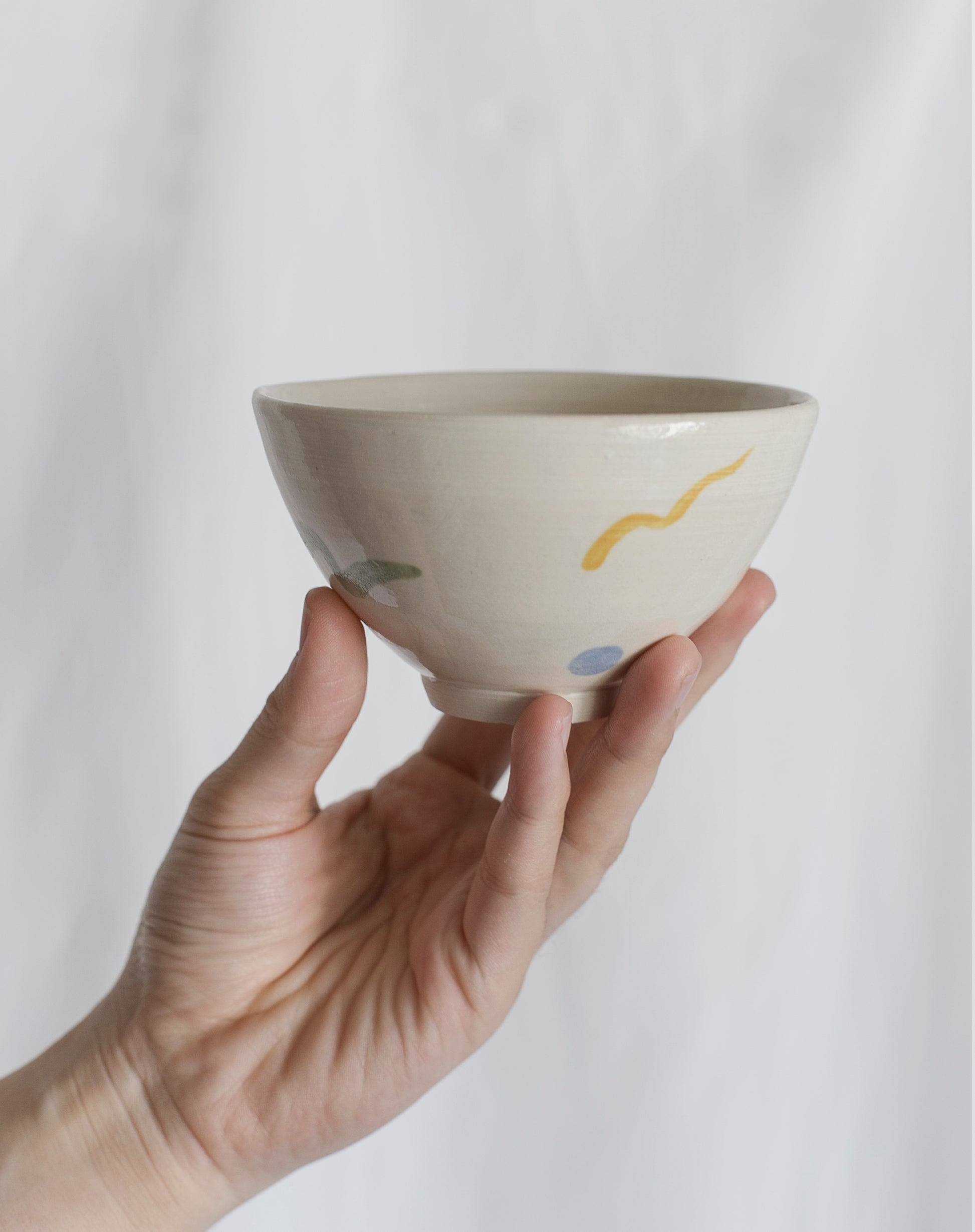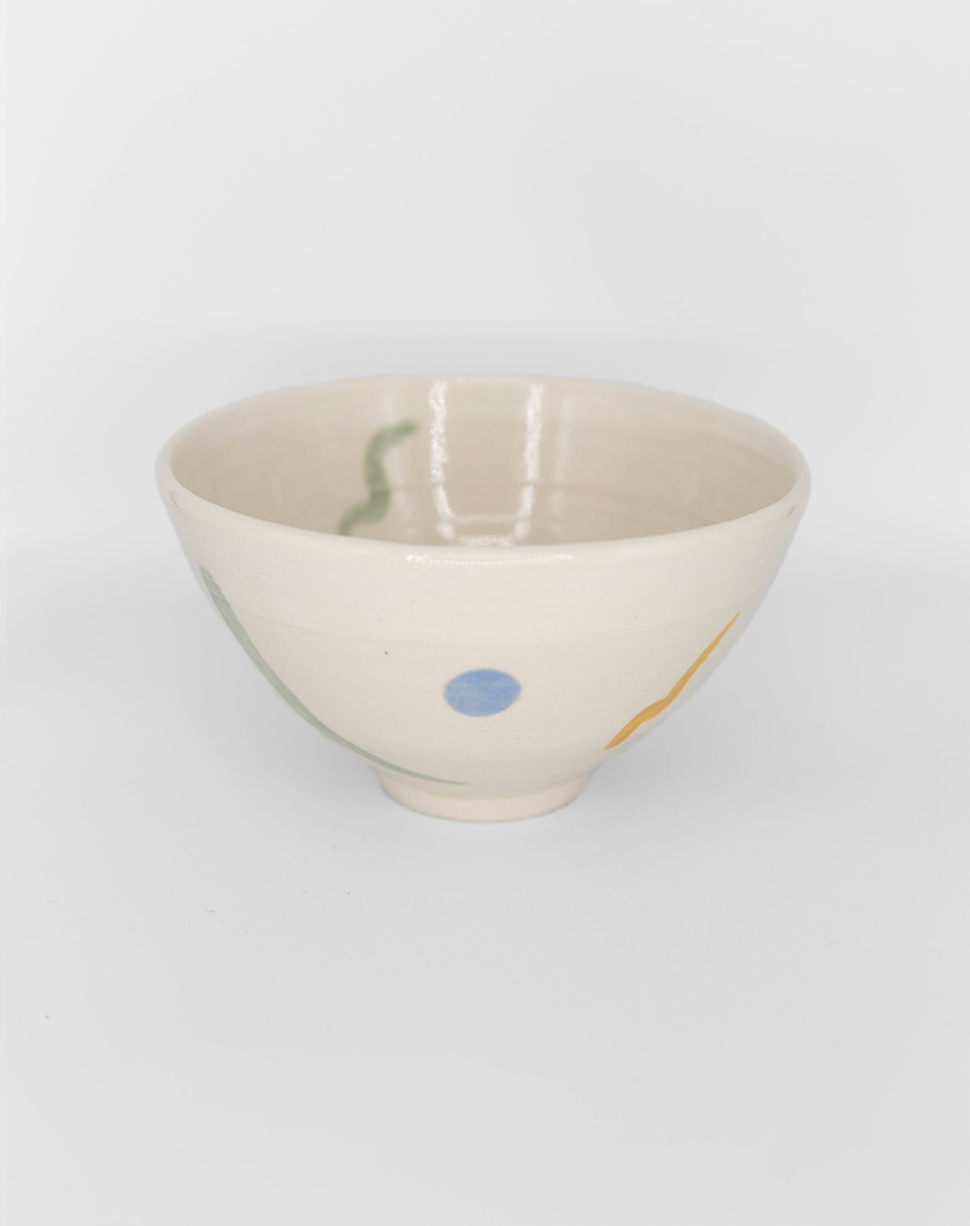 Small bowl with multicolour abstract shapes. Made of white stoneware clay/speckled clay and finished with food safe and dinnerware safe glazing.