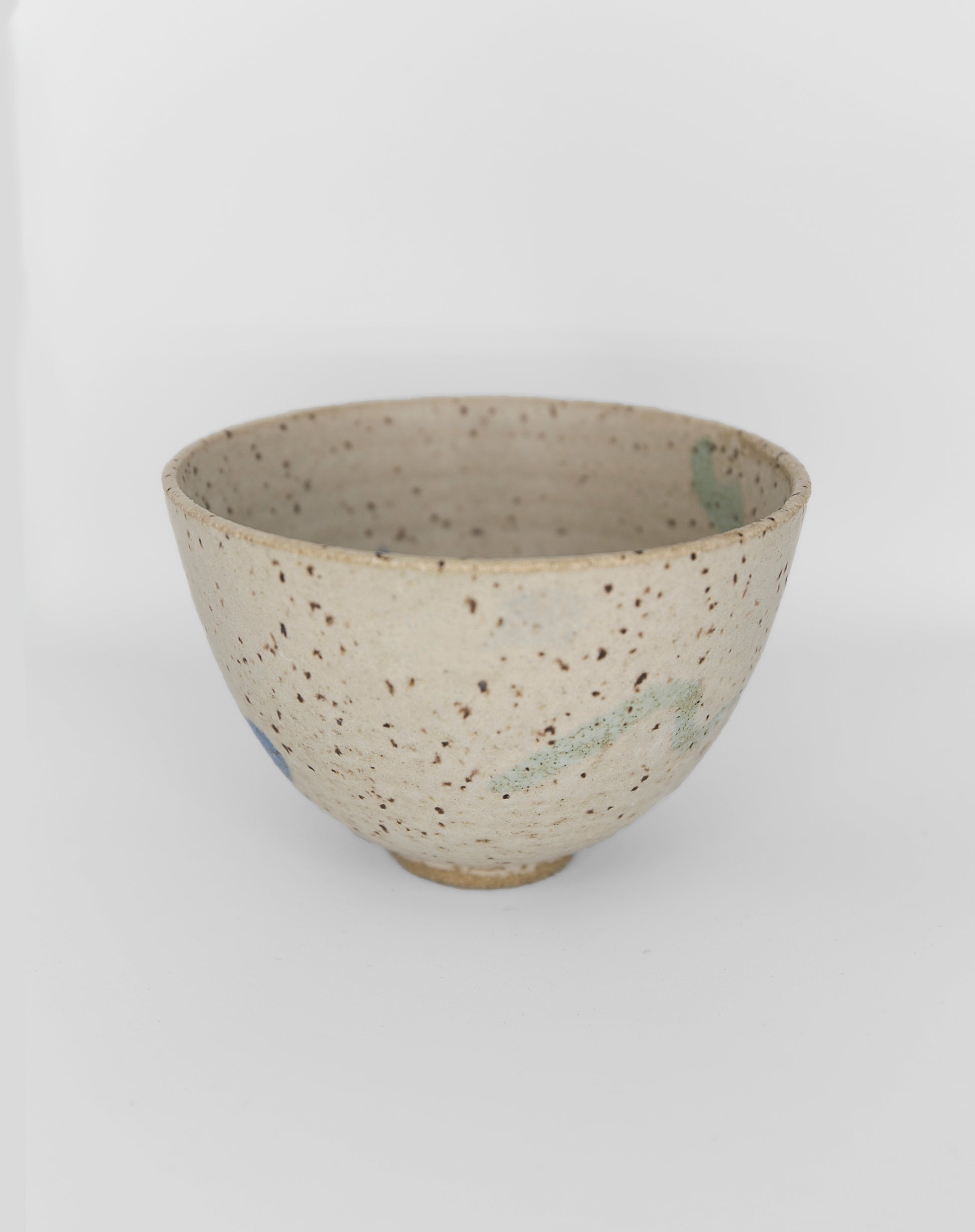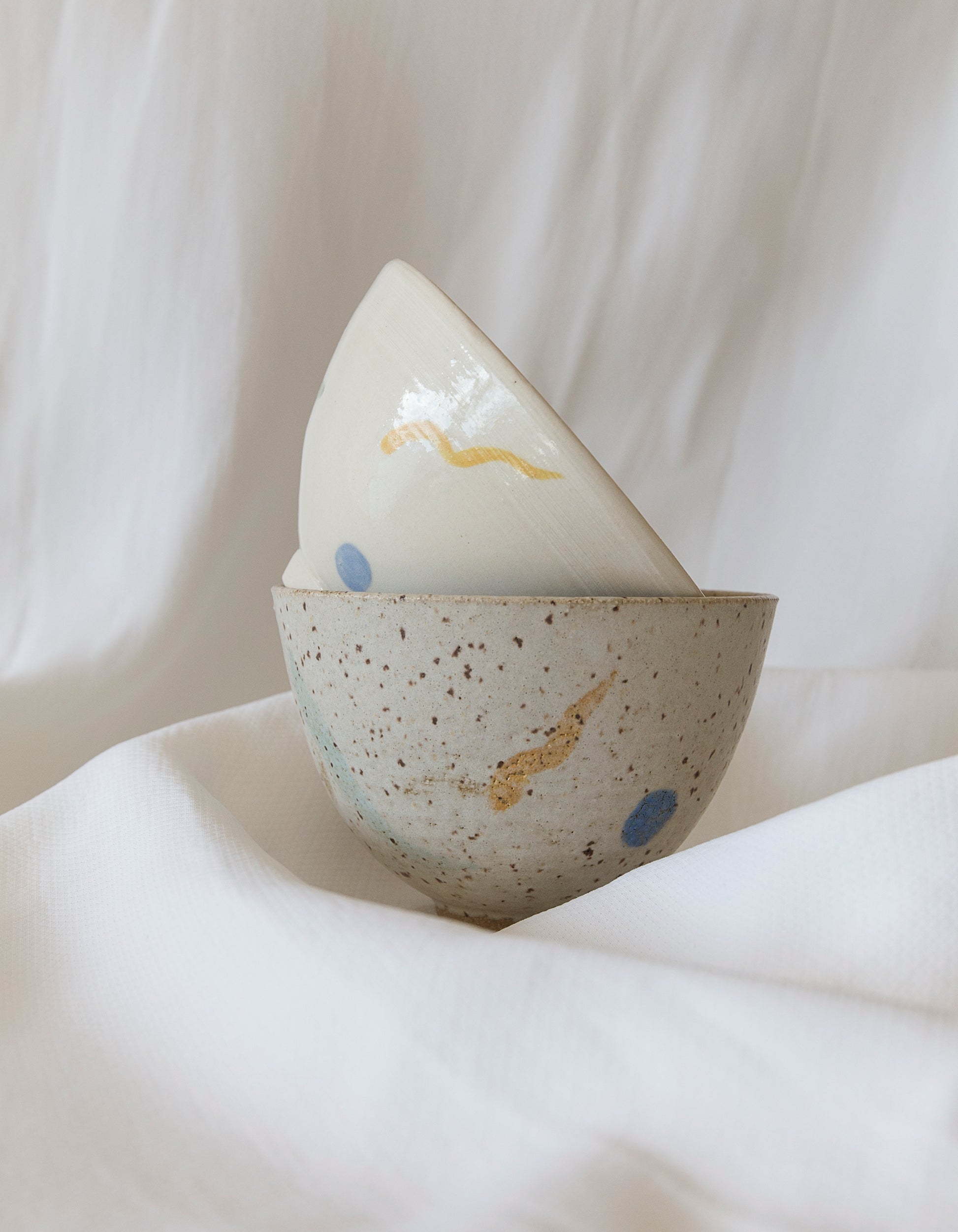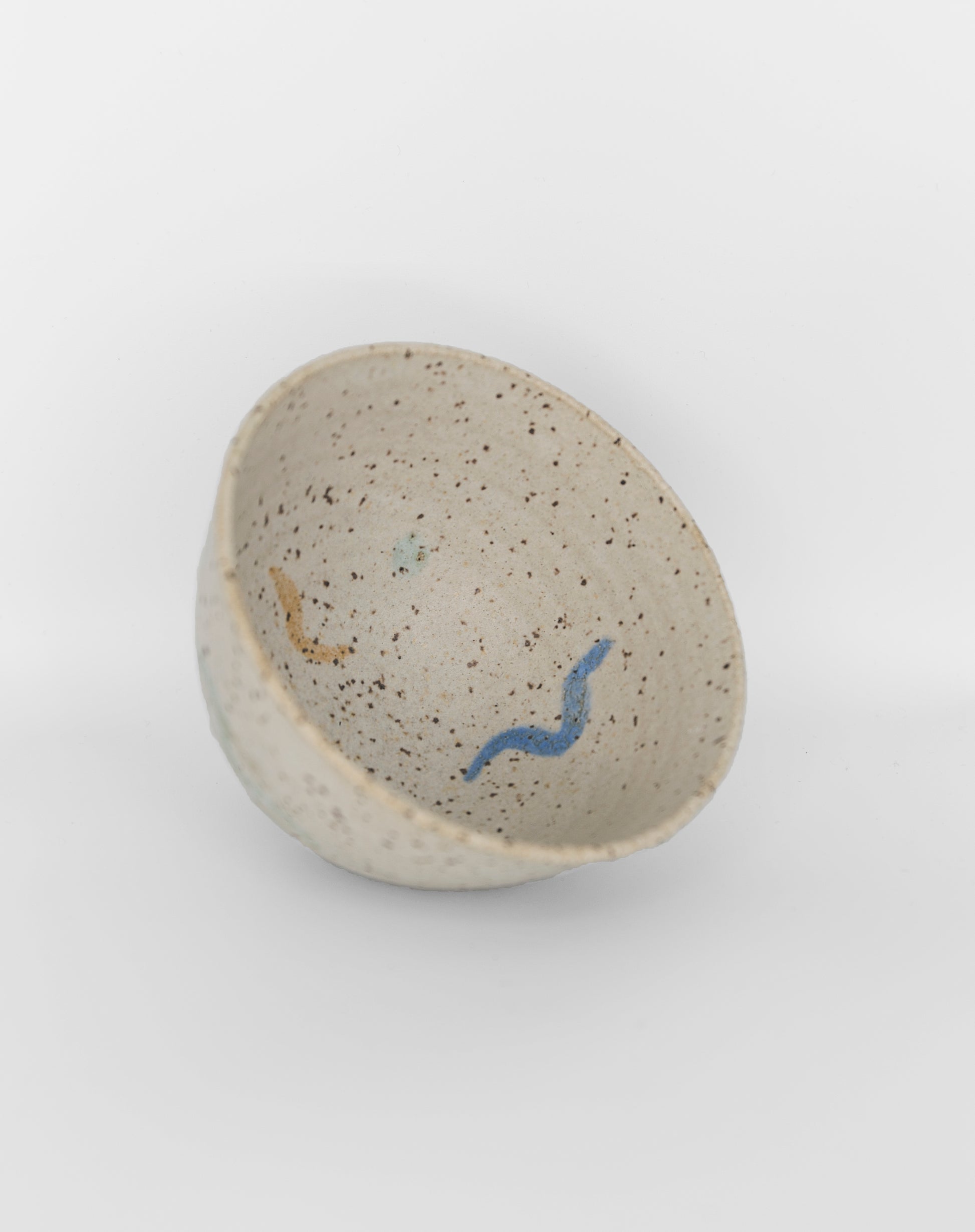 Small bowl with multicolour abstract shapes. Made of white stoneware clay/speckled clay and finished with food safe and dinnerware safe glazing.